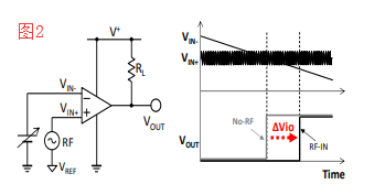 圖1和圖2顯示了運(yùn)算放大器和比較器的失調(diào)電壓偏移,當(dāng)射頻信號被照射時從簡單的天線到安裝設(shè)備的測試板,設(shè)備的輸入偏移電壓會波動,并導(dǎo)致晶振輸出信號偏移或閾值電壓偏移,我們在本應(yīng)用筆記中將此現(xiàn)象稱為"偏移電壓偏移",這種"偏移電壓偏移"可能導(dǎo)致故障電子設(shè)備,RF信號傳播到器件,引起偏移電壓偏移,其所考慮的RF信號線包括PCB圖案,電纜,封裝的引線和器件的鍵合線,但是,由于RF信號的波長(例如,在2.4GHz處為13cm,在900MHz處為33cm)足夠長封裝引線和焊線(幾毫米),PCB圖案或電纜通常用作天線,何時用作天線RF信號到達(dá)引腳,導(dǎo)致偏移電壓偏移.