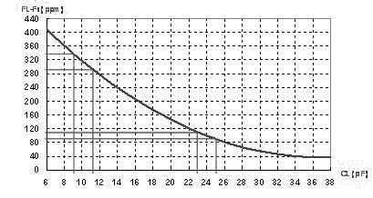 頻率的“牽引率”指的是負載電容CL1的頻率FL1到負載電容CL2的頻率FL2的頻率變化. 在(圖十一)中可以是FL1(CL=24pF)與FL2(CL=10pF)的頻率變化值."FW2500016Z"在這個例子中的頻率牽引率是 220 ppm. 若我們將CL1與CL2的負載電容值趨近極小化(曲線作數(shù)學(xué)上的微分), 就會得到曲線的切線值. 這個切線值就是用某一個負載電容的敏感度( trim sensitivity ).