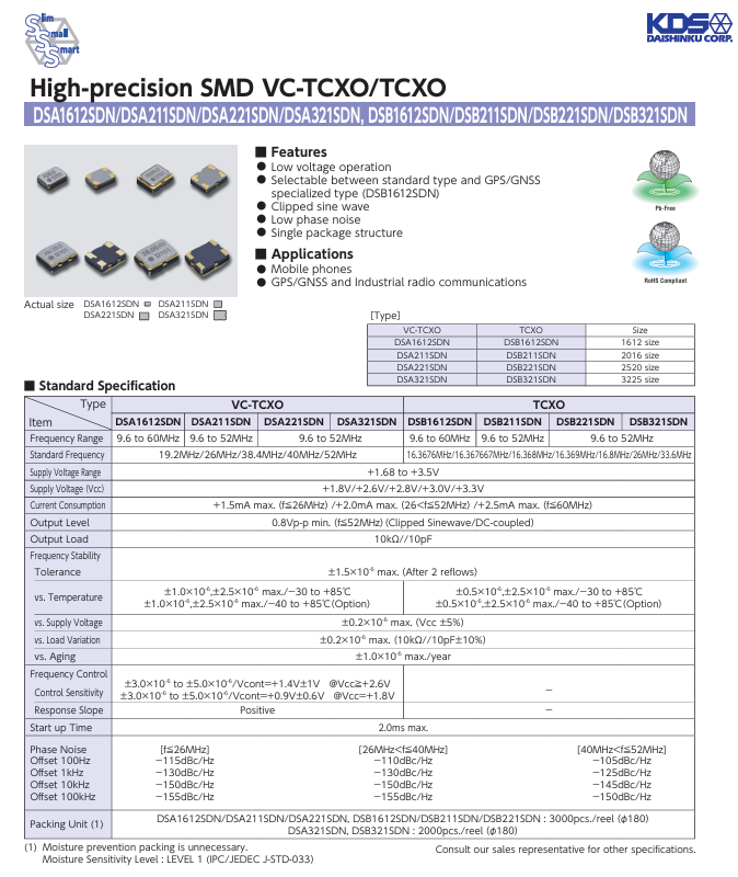 特征 低電壓作削波正弦波低相位噪聲單封裝結(jié)構(gòu)