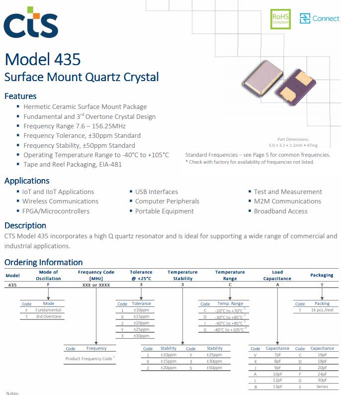 CTS晶振公司推出的435型的標(biāo)準(zhǔn)產(chǎn)品特性和常見(jiàn)市場(chǎng)應(yīng)用總結(jié)如下。