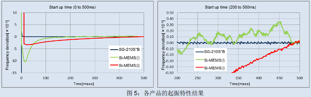 《圖5》表示以1毫秒為間隔的0至0.5秒時(shí)間段中,在3.3V電源電壓、+25℃的條件下各振蕩器通電后的起振特性。