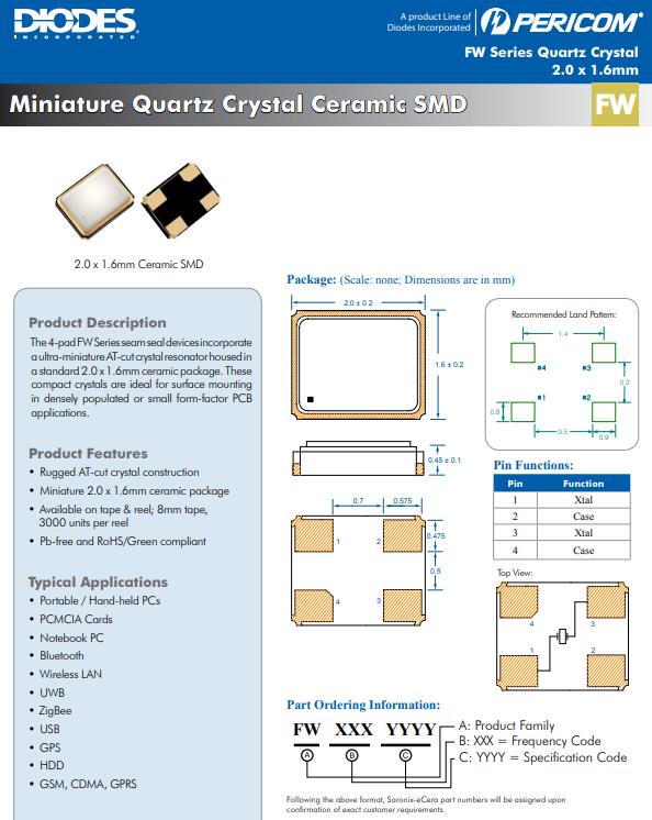 FW374WFMR1緊湊型石英晶體是手持電腦最佳甄選,Diodes作為臺灣知名晶振品牌公司,一直以來專注于研發(fā)生產(chǎn)各種各樣高質(zhì)量的產(chǎn)品,同時為高質(zhì)量應(yīng)用特定標(biāo)準產(chǎn)品全球制造商與供貨商,產(chǎn)品涵蓋廣泛領(lǐng)域,包括獨立、邏輯、模擬及混合訊號半導(dǎo)體市場。Diodes服務(wù)的市場包括消費性電子、計算機、通訊、工業(yè)及汽車市場。百利通亞陶公司利用自身對于市場的了解開發(fā)眾多高質(zhì)量的石英晶體產(chǎn)品,也確保所生產(chǎn)的產(chǎn)品能夠滿足用戶不同的需求.