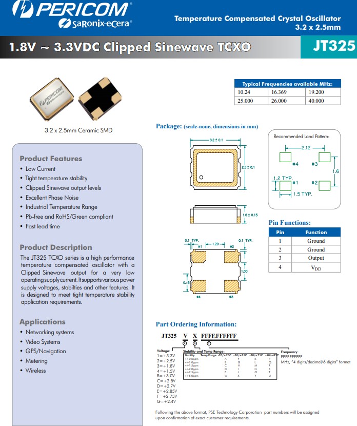 亞陶晶振JT325TCXO系列是一款高性能溫度補償振蕩器,具有削波正弦波輸出,可實現非常低的工作電源電流.它支持各種電源電壓、穩(wěn)定性和其他功能.它旨在滿足嚴格的溫度穩(wěn)定性應用要求.