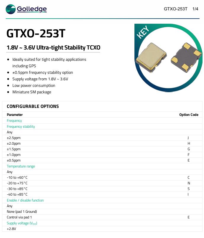 | MP12533 | Golledge | 26.0MHZ GTXO-253T/EI SM TCXO溫補晶振 | GTXO-253T | 1.8V | ±0.5ppm | -40°C ~ 85°C | 4 | 2520 |