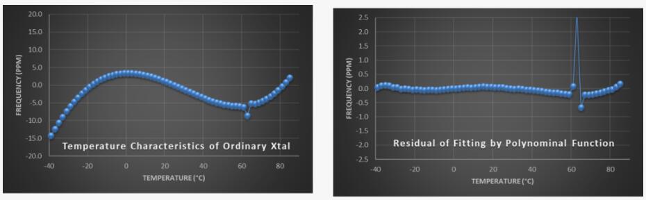 圖4顯示了使用普通石英坯料的TCXO的溫度特性,在63°C時具有意外的頻率擾動.因此,如果工作溫度接近此臨界溫度點,則輸出頻率將發(fā)生突然跳躍.由這種不準(zhǔn)確頻率驅(qū)動的系統(tǒng)至少會暫時出現(xiàn)惡化甚至故障.因此,Jauch溫補晶振只使用高質(zhì)量的石英坯料和復(fù)雜的晶體設(shè)計,以避免我們的TCXO出現(xiàn)任何類型的頻率擾動.