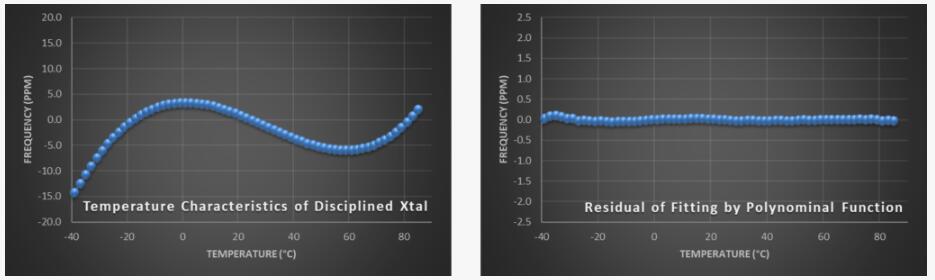 普通石英坯料可能存在輕微的缺陷或雜質(zhì),例如石英表面的拋光區(qū)域不足或晶坯中的晶格無序.這些微小的不規(guī)則性可能會導(dǎo)致特定溫度范圍內(nèi)的快速頻率跳躍,這不能用有限次多項式方程來描述.因此,TCXO溫補晶振的補償機制在這個特定的溫度范圍內(nèi)將是不準確的.這種現(xiàn)象稱為“頻率擾動”,在下面的圖4中進行了可視化.