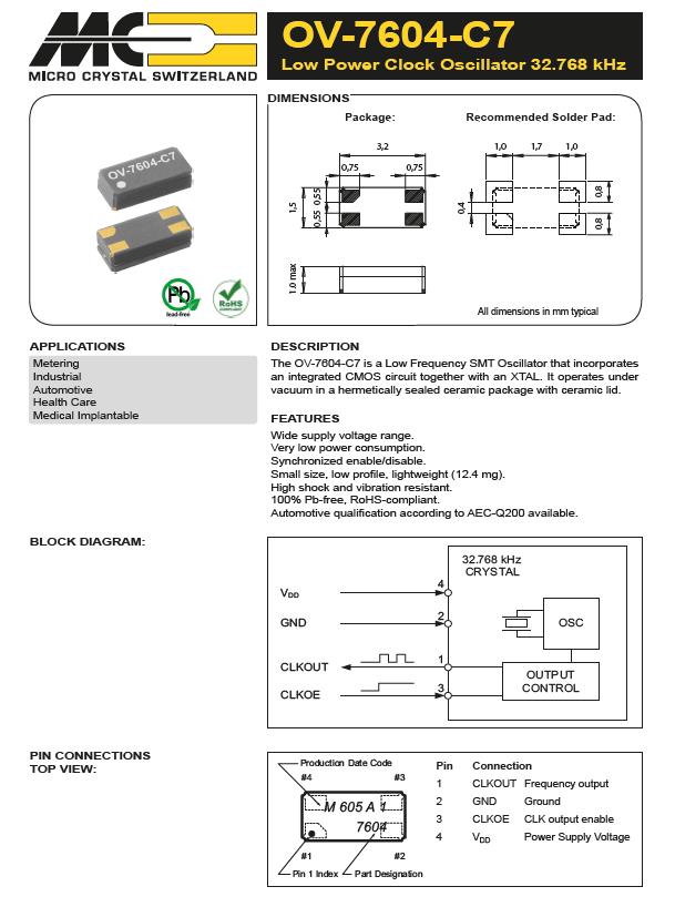 | OV-7604-C7-32.768k-10PPM-TB-QA | Micro晶振 | 標(biāo)準(zhǔn)時鐘振蕩器 32.768 kHz +/-10 PPM -40/+125C AEC-Q200 |