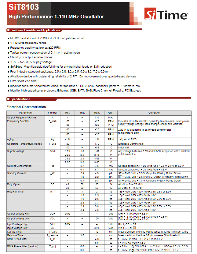 | SIT8103AI-23-33E-100.00000X | MEMS OSC XO 100.0000MHZ LVCMOS | 3.3V | ±50ppm | -40°C ~ 85°C | 4 | 3225 | SiTime | SiT8103 | LVCMOS,LVTTL |