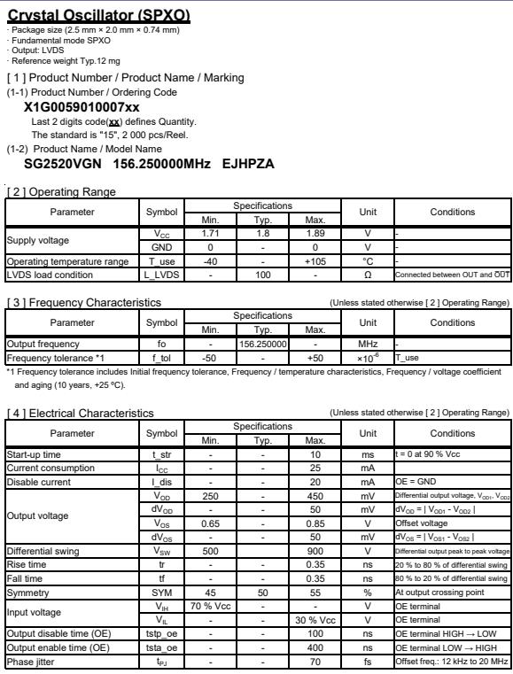 | X1G005901000315 | SG2520VGN | 156.250000 MHz | 2.50 x 2.00 x 0.84 mm | LVDS | 2.375 to 2.625 V | -40 to 85 °C | +/-50 ppm | ≤ 25.0 mA |