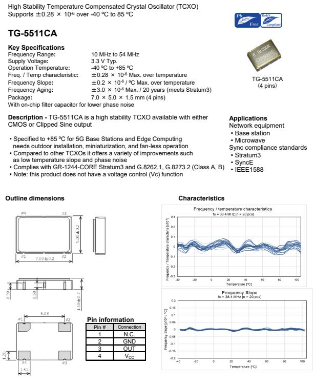 適合5G室外基站專用的TCXO溫補晶振X1G006011004314,愛普生公司推出了TG-5511CA晶振,溫補晶振編碼X1G006011004314,頻率20.000000兆赫,輸出WaveCMOS,電源電壓3.13 ~ 3.46 V,電源電壓(一般)3.300 V,尺寸(LxWxH)7.0 x 5.0 x 1.5 mm,工作溫度-40至+105°C,頻率公差+/- 1.0 ppm,5G基站和邊緣計算可調(diào)至+85℃,需要戶外安裝,小型化和無風扇操作,與其他tcxo相比,它提供了各種改進,如由于低溫的坡度和相位噪聲,符合GR-1244-CORE Stratum3和G.8262.1, G.8273.2 (A類,B類),注意:本產(chǎn)品沒有電壓控制(Vc)功能.