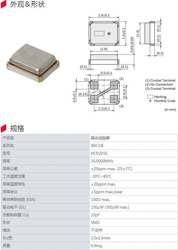 | XRCGB26M000F3M00R0 | HCR2016 | 26.0000MHz | ±30ppm max. (25±3℃) | 消費(fèi)級 |