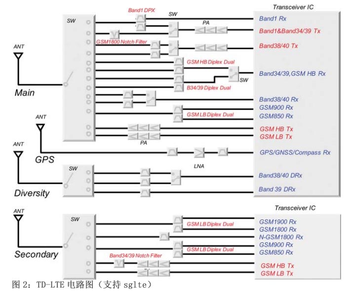 圖2說(shuō)明了一個(gè)電路TD-LTE(sglte).目前終端支持TD-LTE當(dāng)然需要進(jìn)行雙重模式或三模式支持GSM或UMTS以提供語(yǔ)音通信.對(duì)于GSM,四條帶,850MHz 900MHz 1800MHz和1900MHz,,,,一般為國(guó)際漫游的支持,和一個(gè)過(guò)濾器是將每個(gè)波段的接收端上.UMTS,因?yàn)樗膸?雙工(FDD,天線(xiàn)共享器)是必需的.