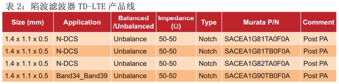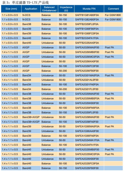 1至3顯示的表面聲波(SAW)的產(chǎn)品線(xiàn)表TD-LTE,村田制作所發(fā)布了到目前為止濾波器.雙濾波器列于表1,表2和表3中的陷波濾波器,單濾波器.